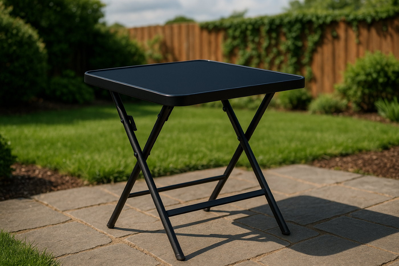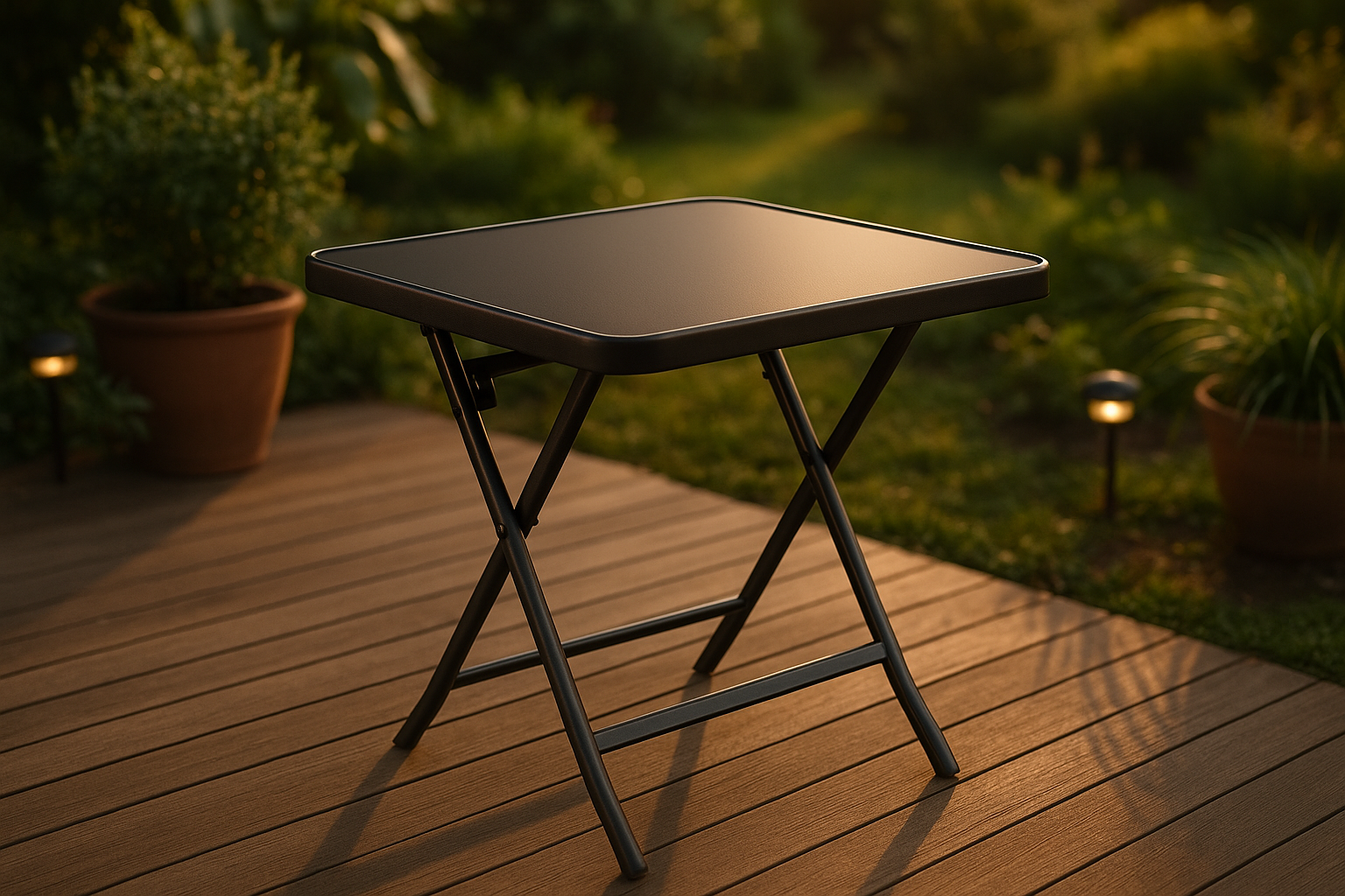 🪴 Masă pliabilă din metal cu sticlă neagră – 80x80 cm